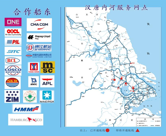 公司目前已开辟河海直达航线10余条,主要分布长三角苏南、苏北地区地区的内河码头,并向苏皖地区延伸,努力实现各航线的网络化管理,一体化调配,实现各内河港码头多港联动、班轮化运营。至今,公司航线造盖内河码头包括苏州、常州、金坛、宿迁、淮安、合肥等。